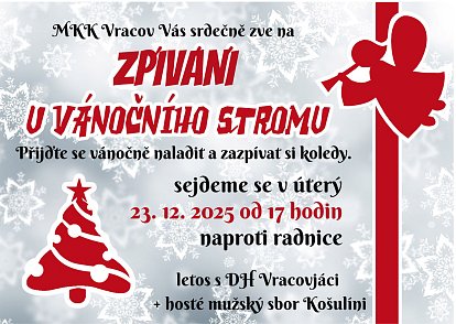- MKK Vracov Vás srdečně zve na Zpívání u vánočního stromu s dechovou hudbou Vracovjáci a mužským sborem Košulíni v úterý 23. 12. 2025 od 17:00 hodin na náměstí. Přijďte se vánočně naladit a zazpívat si koledy.